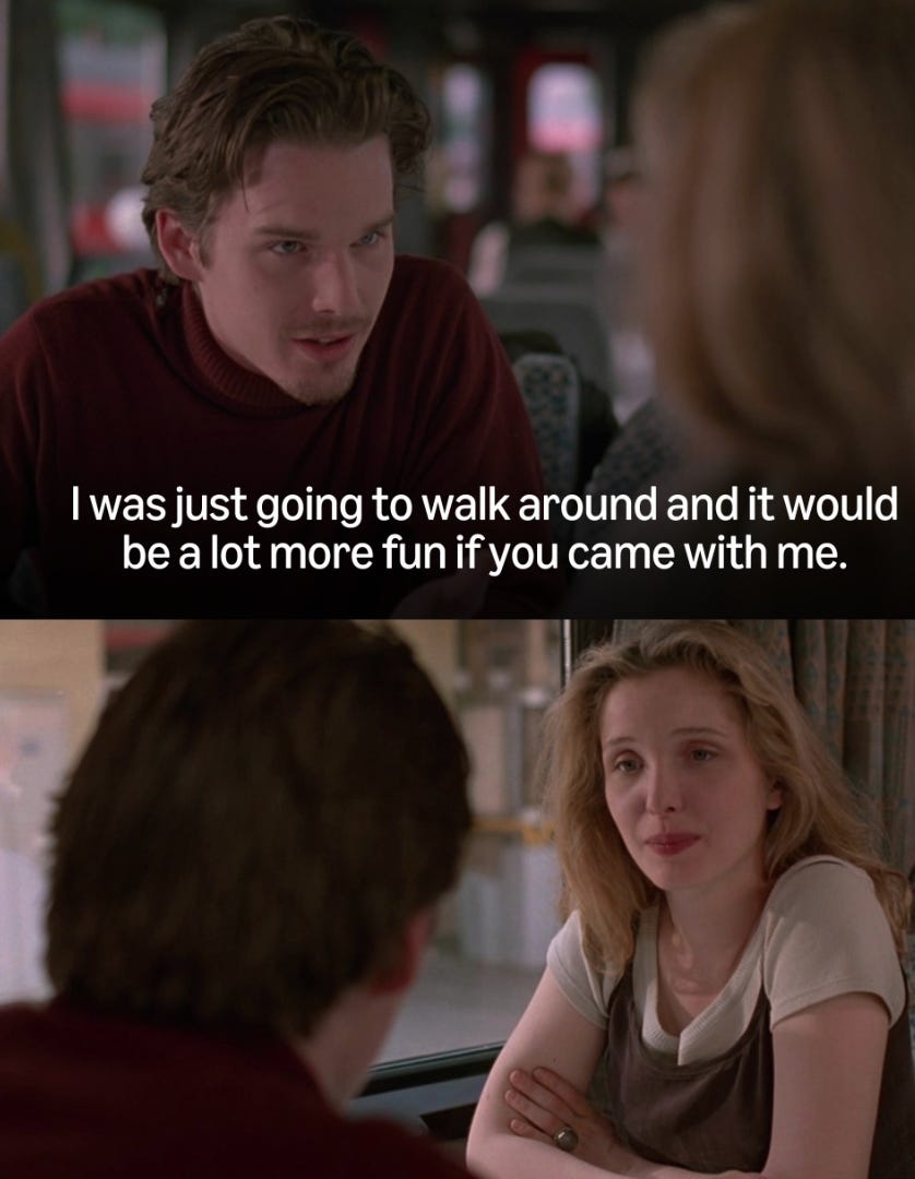 Richard Linklater was inspired to write Before Sunrise after meeting a woman in a Philadelphia toy shop and wandering with her deep into the night. As a college freshman enamored with the possibility of finding a gorgeous Bataille-reading blonde out and about I always wondered: is this a real thing that happens? A momentary connection with a beautiful woman that evaporates just as quickly as it began?